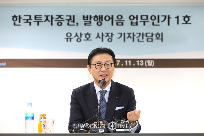 유상호 한국투자증권 사장은 13일 서울 여의도 본사 5층에서 기자간담회를 열고 제1호 초대형 투자은행(IB)으로 인가 받은 것과 관련해 입장을 밝히고 있다. 유 사장은 이날 "업계 최고 수준의 투자은행(IB) 역량을 활용해 한국판 '골드만삭스' 모범 모델을 시장에 안착시키겠다"고 말했다. (제공 = 한국투자증권)