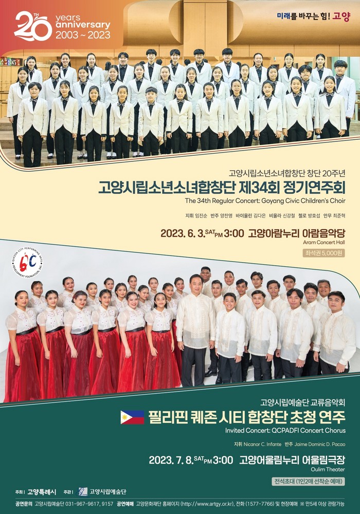 지난 20년을 돌아보고 더욱 성장하는 희망찬 내일을 노래하는 고양시립소년소녀합창단 제34회 정기연주회 티켓은 전석 5,000원이다. 예매 및 관련 문의는 고양문화재단으로 공연문의는 고양시립예술단으로 하면 된다.