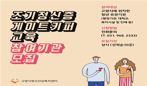 [부자동네타임즈 김인수기자] 고양시 정신건강복지센터가 청소년·청년의 정신건강문제를 조기 발견하기 위해 유관기관 실무자에게 조기정신증 게이트키퍼 교육을 실시한다.