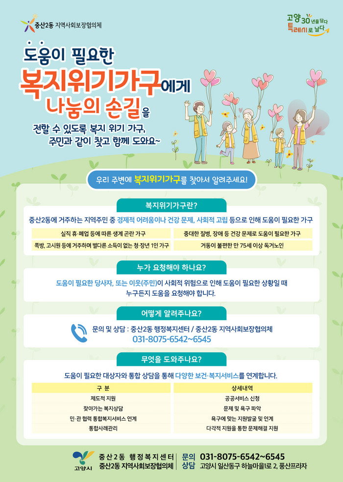 발굴된 위기가구는 종합상담을 통해 기초생활보장제도와 같은 공적급여, 긴급 복지를 비롯해 돌봄서비스, 후원금, 민간자원 연계 등 가구별 상황에 맞는 맞춤형 복지서비스를 제공받는다.