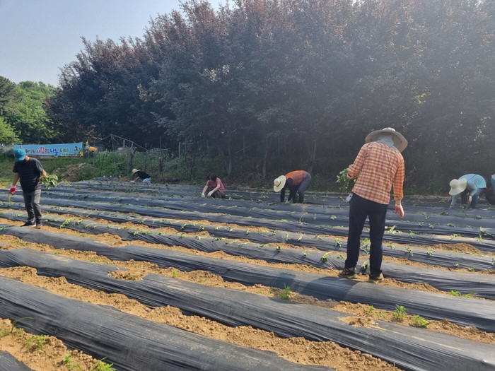 15일 사랑의 나눔 텃밭에 주민자치회 위원들이 참석하여, 지난 4월부터 주민자치회 위원들이 고르고, 고랑을 만들어 놓은 밭에 고구마 모종을 심었다.