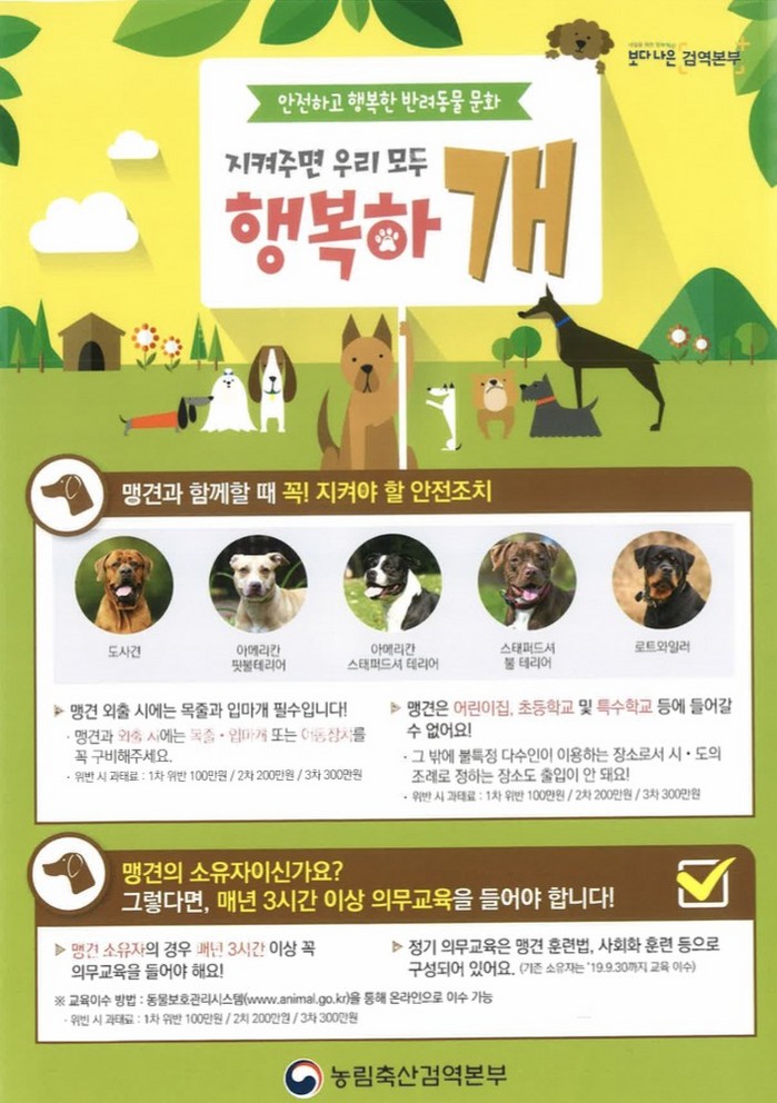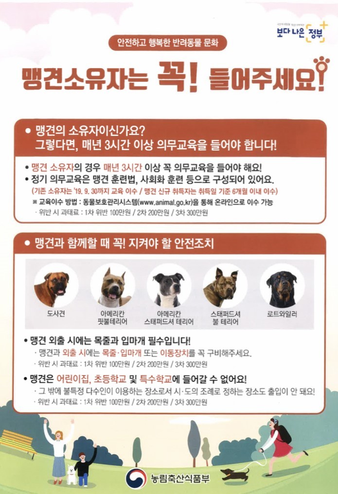 이 두 가지 조항을 위반할 경우 300만 원의 과태료가 부과되며, 법정의무 교육은 동물보호관리시스템에서 온라인으로 이수 가능하다. 또한 맹견 소유자는 동물보호법에 의거해 다음과 같은 관리 및 이동수칙을 준수해야 한다.