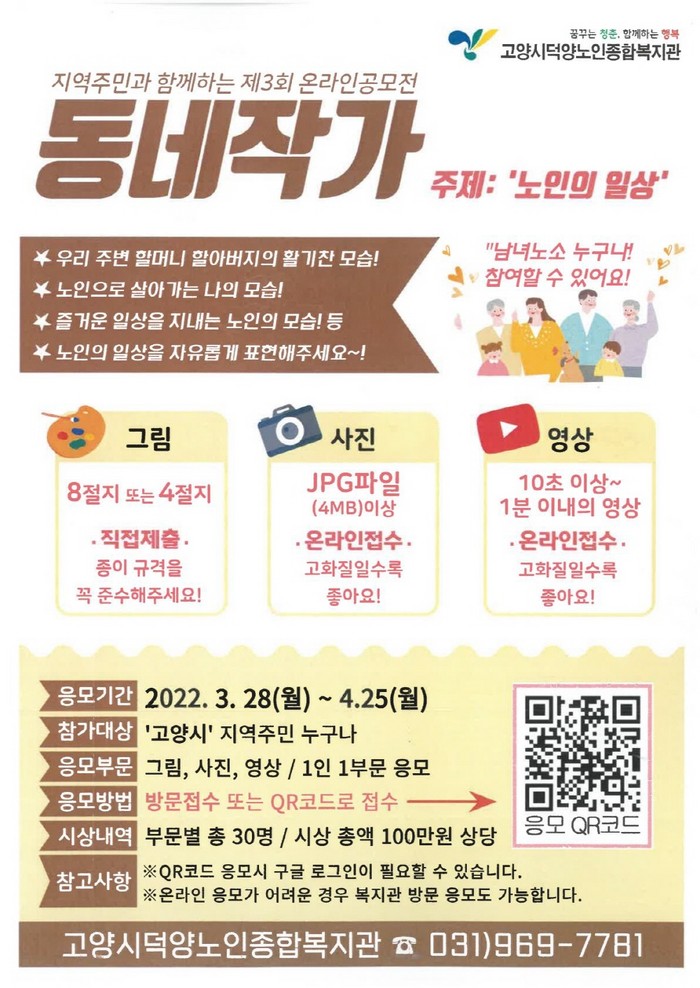 참여는 고양시덕양노인종합복지관 홈페이지 공지사항 또는 현수막, 전단 홍보물에 포함된 QR코드를 통해 지역주민 누구나 응모 가능하며 심사 및 투표는 전문가 투표와 더불어 공개 투표를 통해 진행될 예정이다.