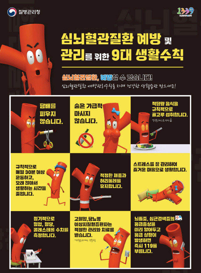 주목할 것은 ▲정기적으로 혈압, 혈당, 콜레스테롤 수치를 측정한다 ▲고혈압, 당뇨병, 이상지질혈증 환자는 생활습관을 개선하고 약물치료 등 적절한 관리와 치료를 받는다 ▲뇌졸중, 심근경색증의 응급증상을 미리 알아두고 응급상황 발생 땐 즉시 119의 도움을 받는다 등 도움을 받을 수 있는 의료기관을 미리 알아두고 지속적인 관리를 받을 것을 강조한다는 점이다.