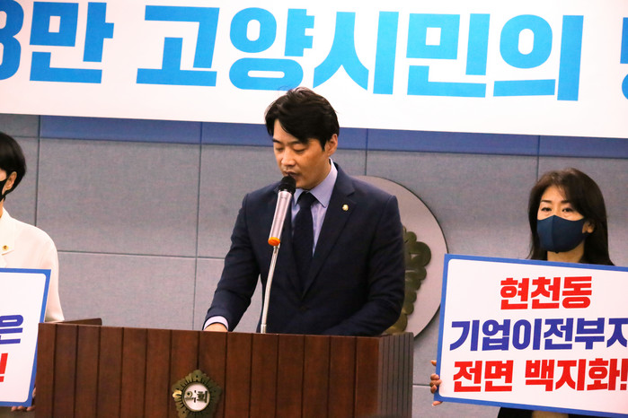[부자동네타임즈 김인수기자] 지난 29일 고양시특례시의회 영상회의실에서 지역 시도의원들과 함께 고양시에 있는 서울시 기피시설 이전을 촉구하는 성명서를 발표했다.