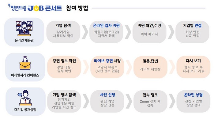 대기업 공채상담에는 LG전자, NH농협은행, 롯데백화점, 이마트, 현대모비스, 현대백화점그룹, 효성중공업 등이 참여한다. 화상회의 솔루션을 이용해 온라인 상담이 이뤄지며, 사전신청을 한 청년에게는 접속 링크를 별도로 제공한다.