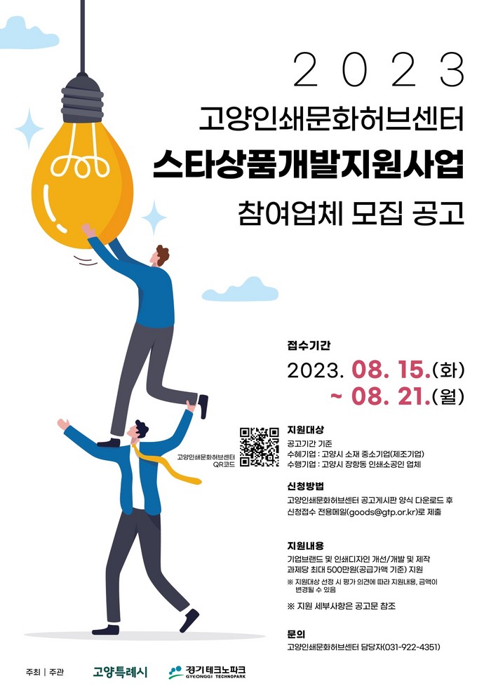 [부자동네타임즈 김인수기자] 고양인쇄문화허브센터가 8월 15일부터 8월 21일까지 ‘2023년 스타상품개발 지원 사업’의 참여 업체를 모집한다.