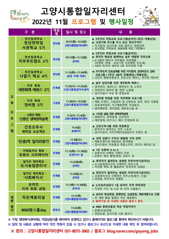 [사진설명] 11월 고양시통합일자리센터 프로그램 및 행사일정.