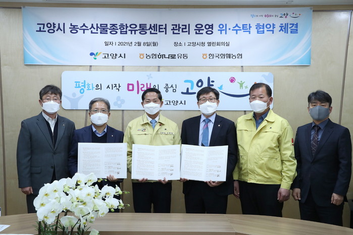 [부자동네타임즈 김인수기자] 고양시가 지난 8일 시청 열린회의실에서, 일산서구 대화동에 소재한 ‘고양시 농수산물종합유통센터’의 관리운영 관련해, 농협하나로유통(대표이사 김병수) 및 한국화훼농협(조합장 강성해)과 위·수탁 협약을 체결했다.
