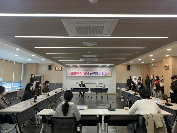 이날 간담회는 인사이동이나 신규 임용 등으로 변동이 생긴 행정복지센터 사회복지 담당자를 대상으로 2022년 기초생활보장사업 주요 개정사항, 사회보장급여서비스 신청·접수 시 당부사항 및 사회보장급여 주요 내용을 전달하고, 행정복지센터 담당자의 애로사항을 청취 및 구청의 협조사항을 공유하기 위해 실시되었다.