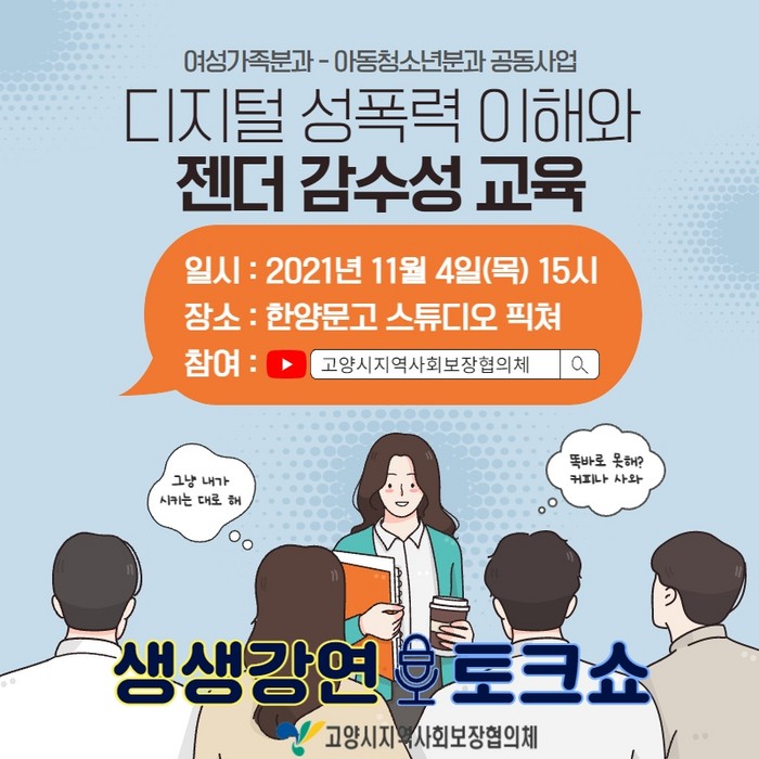 [부자동네타임즈 김인수기자] 고양시 지역사회보장협의체(여성가족·아동청소년분과)에서는 11월 4일, 고양시민을 대상으로 온라인‘디지털 성폭력 이해와 젠더 감수성 교육(생생강연·토크쇼)’을 실시할 예정이다.