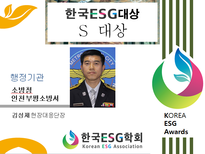 지난 10일 국회도서관 대강당에서 500여명이 참석한 가운데 거행된『제3회 대한민국 ESG대상 시상식』에서 소방청 인천부평소방서 김성제 현장대응단장(시인, 수필가)이 개인부문 ESG대상을 수상하며 박수를 받았다.