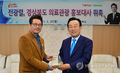 | △ 탤런트 전광렬(55·왼쪽)씨가 20일 김관용 경북도지사로부터 '의료관광 홍보대사' 위촉장을 받고 있다. |