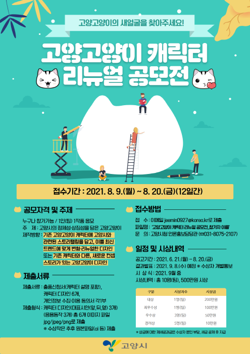 공모 주제는 고양시의 정체성·상징성을 담은 고양고양이다. 고양고양이 캐릭터에 관심 있는 사람이라면 지역에 관계없이 누구나 응모할 수 있다.