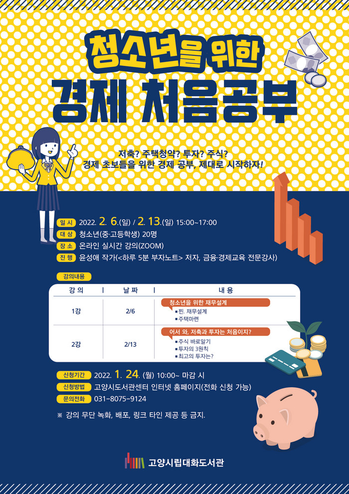 [부자동네타임즈 김인수기자] 고양시 대화도서관이 오는 2월 6일부터 청소년 대상 경제 특강 청소년을 위한 경제 처음공부을 온라인으로 운영한다.