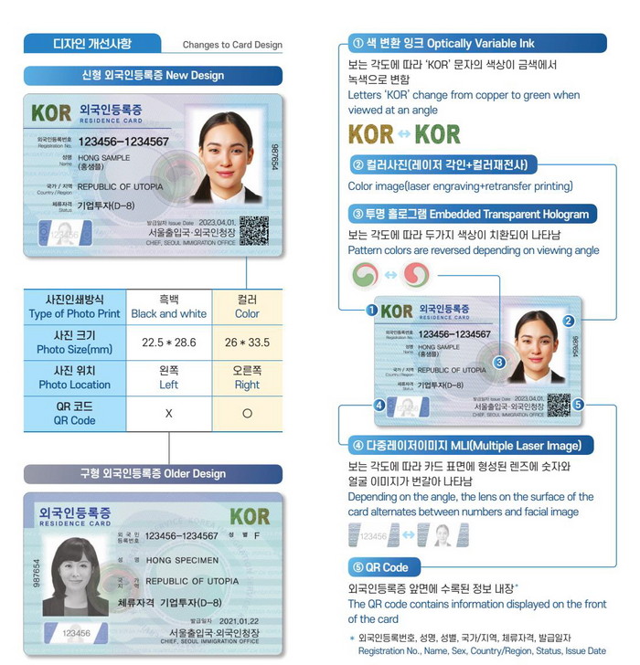 변경된 외국인 등록증은 사진이 컬러로 인쇄되고 크기가 확대돼 본인 확인이 용이해졌다. 또한 사진 위치가 왼쪽에서 오른쪽으로 변경됐다.
