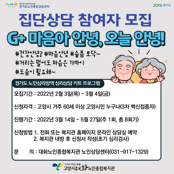 모집기간은 3월 4일까지이며, 참여기간은 3월 14일부터 5월 27일까지(총 8회기) 8명씩 총 3개 집단으로 진행할 예정이다. 참여 대상은 고양시에 거주하는 60세 이상의 고양시민 중 백신3차 접종 완료자에 한해서 신청 가능하며, 신청서 제출 후 심리검사와 초기 상담에 따라 결정된다. 코로나블루로 우울, 심리적 어려움이나 부정적 정서를 느끼시는 분들, 건강한 몸과 마음으로 회복을 원하는 분들에게 도움이 될 것으로 기대된다. 참여 신청과 집단 프로그램과 관련한 자세한 사항은 고양시대화노인종합복지관 노인상담센터로 문의하면 된다.