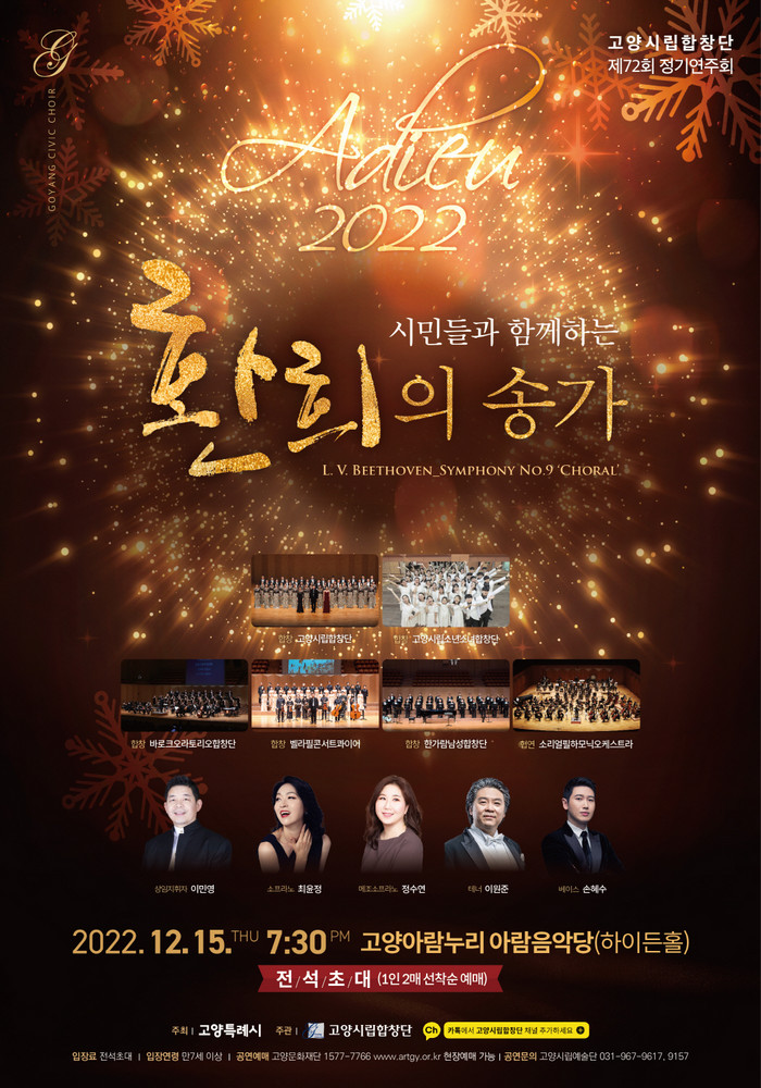 고양특례시의 대표 문화 아이콘으로서 문화공연의 선두 역할을 하고 있는 고양시립합창단은 한 해 동안 땀 흘리며 수고한 모두를 응원하는 특별한 음악 선물을 보내는 마음으로 이번 72회 정기연주회 예약을 전석 초대로 진행했다.