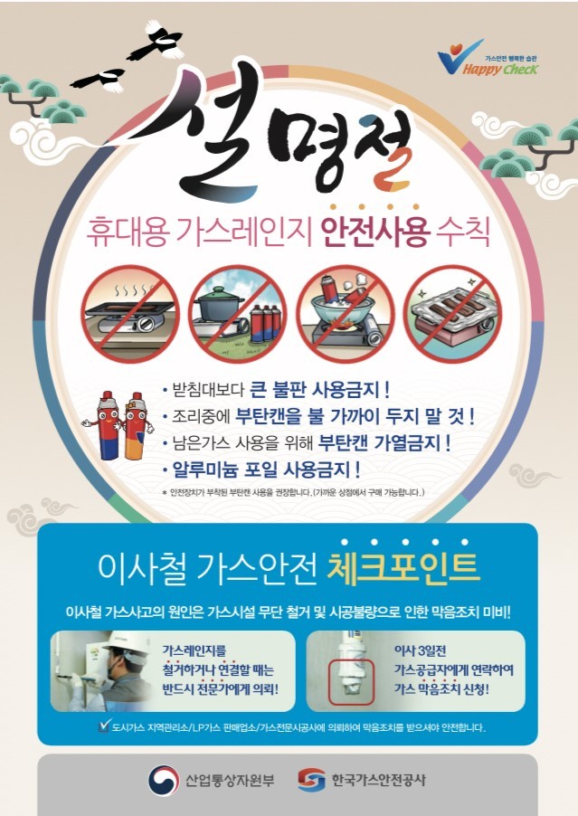 설 연휴기간 가스사용량 증가로 사고발생 개연성이 높아짐에 따라 가스 사고를 예방하기 위해서는 가정 내에서 휴대용 가스레인지 사용 시, 받침대보다 큰 불판 사용금지, 조리 중 부탄캔을 불 가까이 두지 말 것, 남은가스 사용을 위해 부탄캔 가열금지, 알루미늄 포일 사용금지 등의 기본적인 안전수칙을 꼭 준수해야 한다.