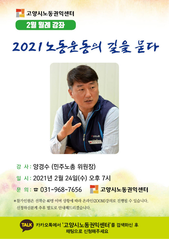 [부자동네타임즈 김인수기자] 고양시노동권익센터는 2월 24일(수) 오후 7시 양경수 민주노총 위원장을 초청하여 민주노총의 올해 핵심 사업인 110만 11월 총파업을 비롯한 노동운동의 방향을 주제로 강연회를 개최한다.