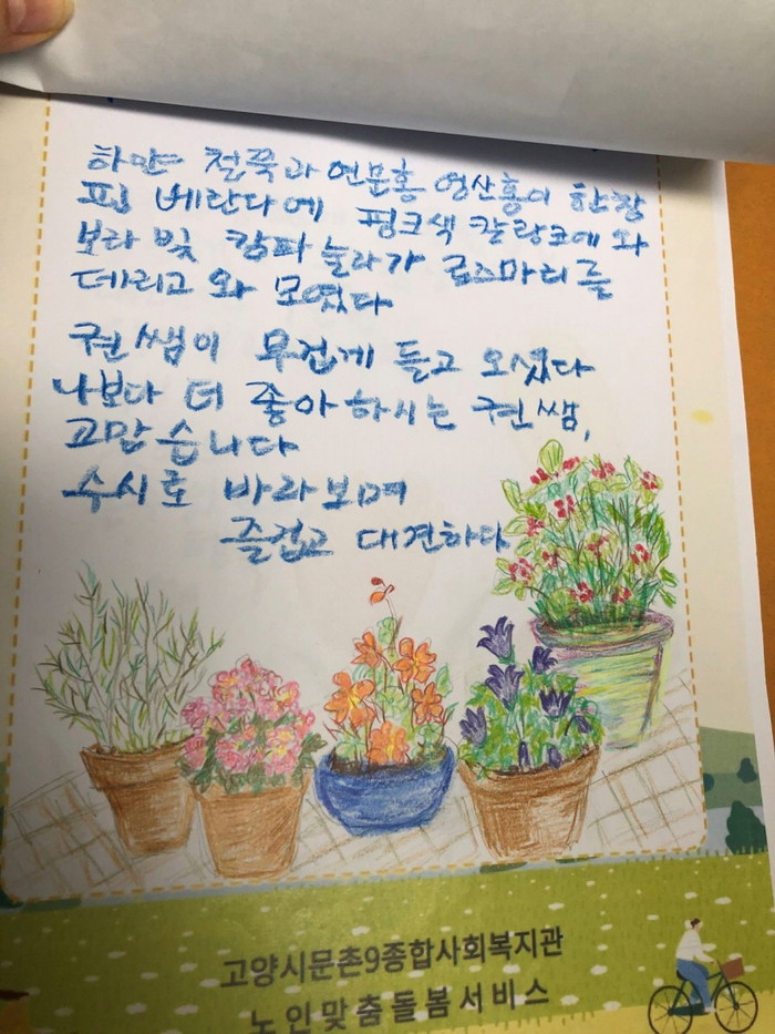 문촌9종합사회복지관은 ‘화초야 놀자’ 참여 어르신 중 6명을 선정해 소정의 상품을 제공했다. 수상한 어르신은 “예쁜 꽃을 보고 그림을 그리는 것만으로 행복했는데 이렇게 선물까지 받으니 너무 좋다”라고 소감을 전했다.