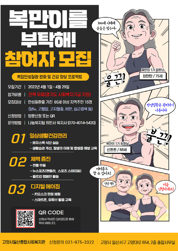 신청 대상은 65세 이상 만성질환으로 인해 일상생활에 불편함을 겪고 있거나 건강 및 체력 증진에 관심이 있는 고양시 주민이다. 참여를 원하는 주민은 고양시일산종합사회복지관 방문 및 전화, 홈페이지를 통해 신청 할 수 있다.