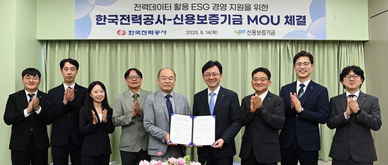 한전은 8월 14일(목) 한전 아트센터에서 신보와 「전력데이터 활용 ESG 경영 지원」을 위한 업무협약(MOU)을 체결했다. 이번 협약은 한전이 보유한 전력데이터와 신보의 금융 인프라를 결합해, 기업의 전기사용량 절감 실적을 기반으로 ESG 성과를 인증하고 우수기업에 금융 우대 혜택을 제공하기 위하여 마련됐다.