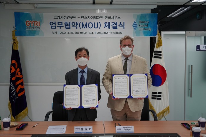 [부자동네타임즈 김인수기자] 고양시정연구원은(원장 정원호)은 26일 오전 고양시정연구원 대회의실에서 독일 한스자이델 재단 한국사무소와 상호업무협약을 체결하고, 연구원과 남북교류와 평화·통일을 위한 정책 개발과 연구 등 상호협력을 확대해 나가기로 합의했다.