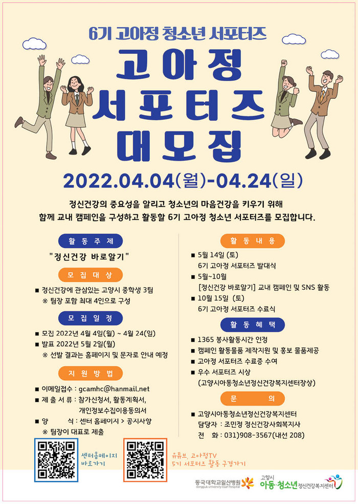 [부자동네타임즈 김인수기자] 고양시 아동청소년정신건강복지센터(센터장 김예니)가 4월 24일까지 관내 중학생을 대상으로 청소년 서포터즈를 모집한다.
