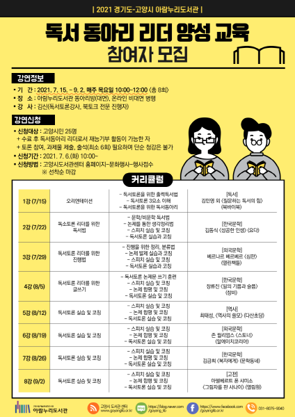 [부자동네타임즈 김인수기자] 고양시 아람누리도서관은 경기도 독서동아리 활성화 사업 지원기관으로 선정돼 오는 7월 15일부터‘독서동아리 리더 양성과정’을 운영한다.