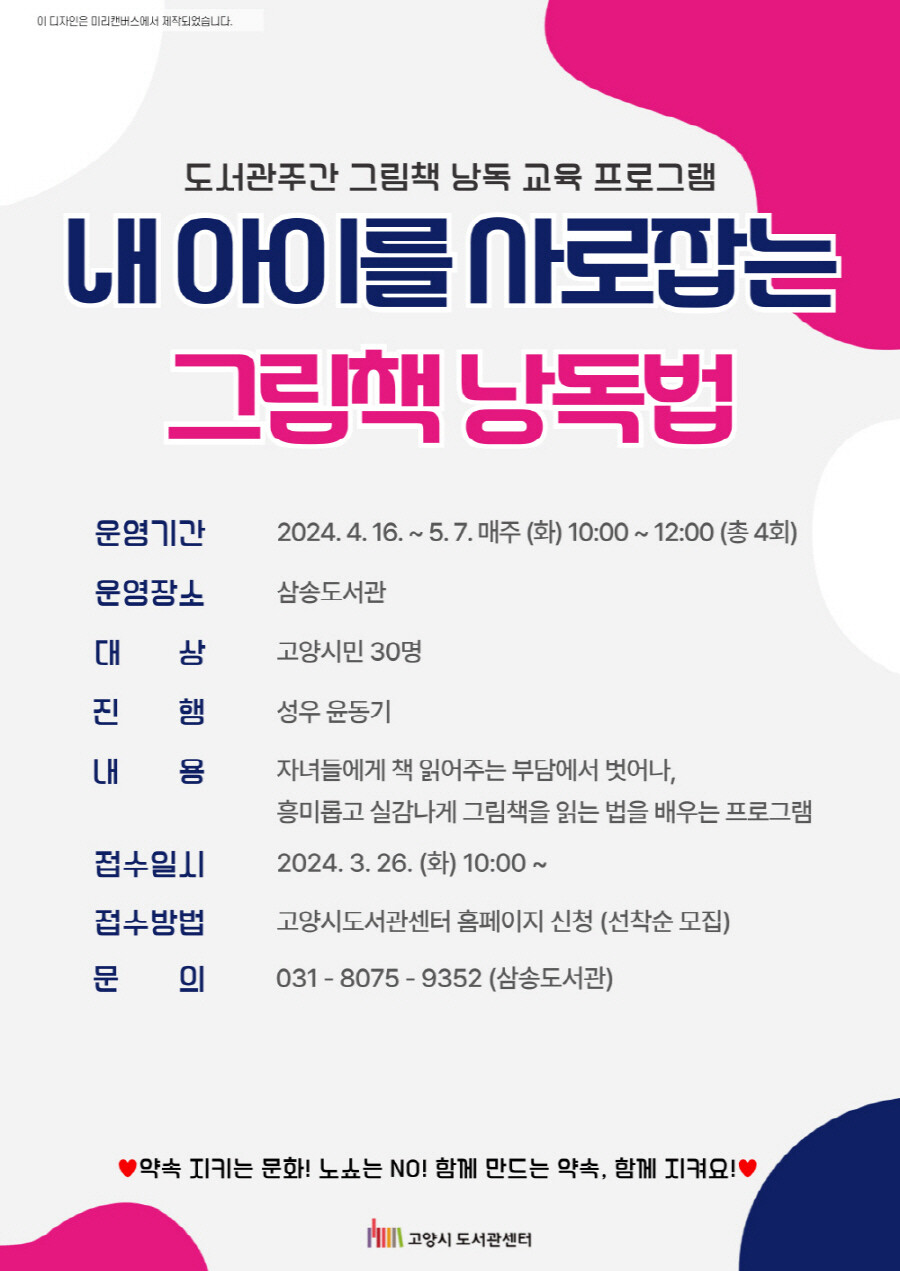 프로그램 신청은 3월 26일 화요일 오전10시부터 고양시도서관센터 누리집을 통해 할 수 있다.