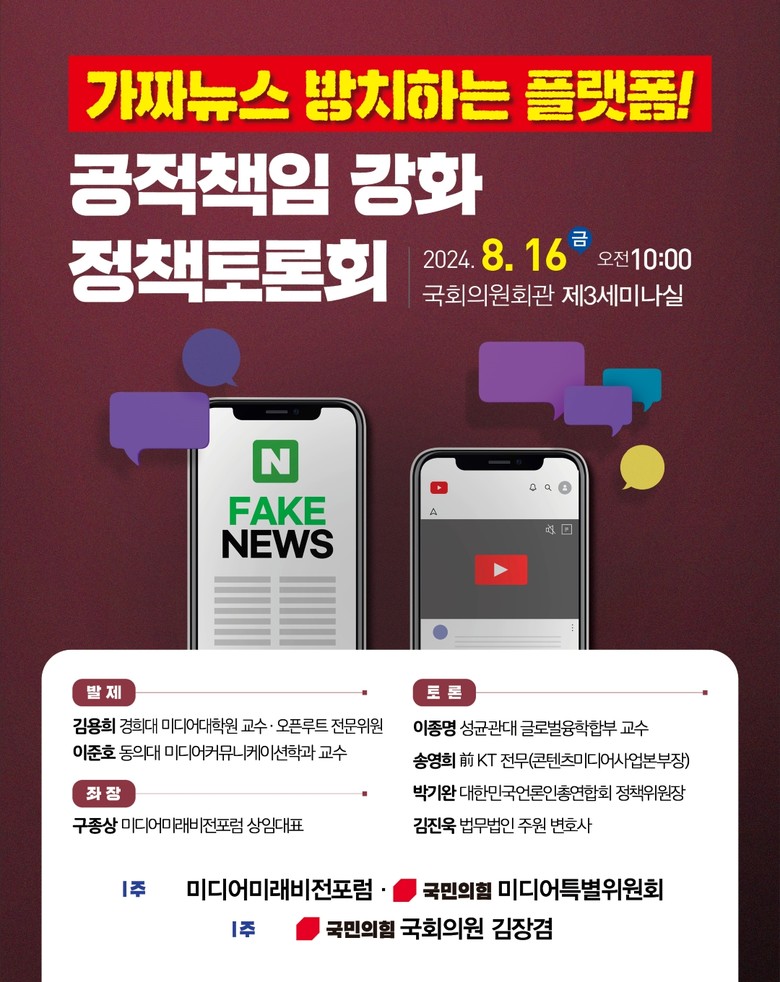 끝으로 행사를 주관한 김장겸 의원은 개회사에서 “ 네이버 , 유튜브 등 플랫폼을 통해 유통되는 가짜뉴스가 우리 민주주의를 위협하고 있다 ” 며 “ 디지털 시대의 가짜뉴스는 빛의 속도로 퍼지는 만큼 플랫폼이 허위정보 유통의 숙주가 되지 않도록 사회적 논의가 필요한 시점 ” 이라며 “ 오늘 토론회에서 전문가 패널과 논의한 내용들을 정책에 반영할 수 있도록 최선의 노력을 다 하겠다 ” 고 밝혔다 .