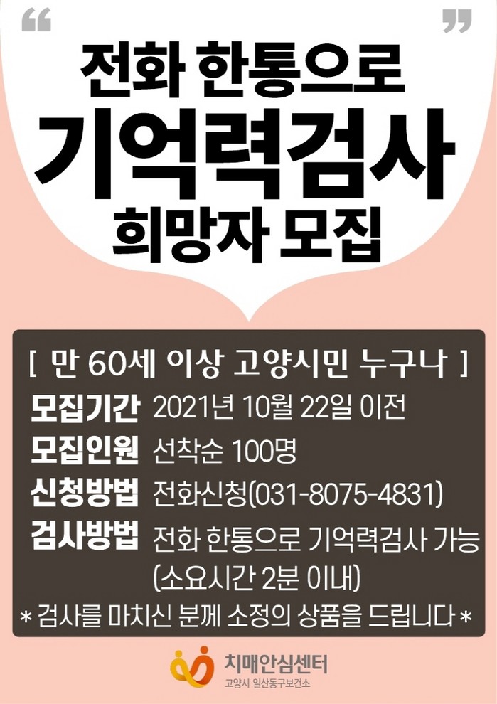 한편, 고양시 치매안심센터는 코로나19의 장기화로 대면 검사에 불안감을 호소하는 시민들에게 전화를 통한 기억력 검사 서비스를 제공해 지속적으로 편리성과 접근성을 강화할 방침이다.