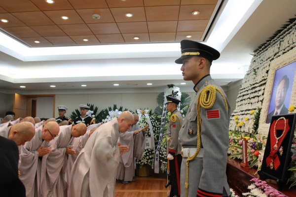 자승 스님은 이어 "바르고 투명한 사회를 향한 굳은 의지와 헌신의 마음으로 일생을 봉사와 정진을 다하셨다"며 "심신은 더욱 청정하고 강건하여 국민을 위하는 모든 사람들의 앞길에 비춰질 지이다"고 언급했다.