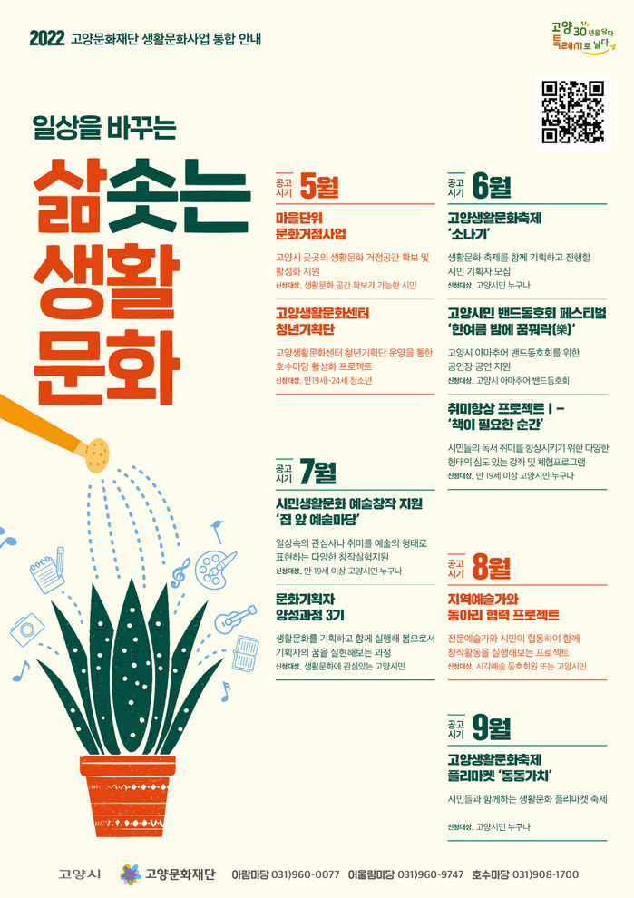 이번 사업은 생활문화에 관심 있는 고양시민이면 누구나 지원신청이 가능하며, 자세한 지원내용 및 신청방법은 공고 포스터의 QR코드에 접속하여 통합안내서를 다운받거나, 고양문화재단 홈페이지 및 고양생활문화센터 공식블로그에서 확인 할 수 있다.