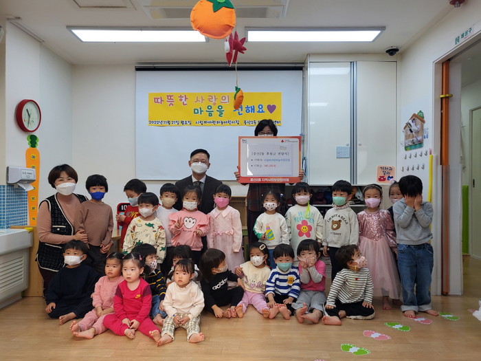기탁금은 지난 10월 시립 파아란하늘 어린이집과 시립 금빛하늘 어린이집이 연합바자회를 열어 얻은 수익금으로 마련됐으며, 경기사회복지공동모금회를 통해 중산2동 취약계층을 위한 사업에 사용될 예정이다.