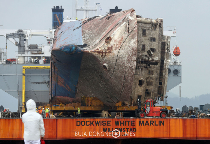 세월호 선체를 육상에 거치하는 작업이 초읽기에 들어간 5일 오전 전남 목포신항만에서 세월호가 모듈 트랜스포터를 이용한 육상거치를 위해 방향을 바꿔 재접안하고 있다. 2017.04.05.