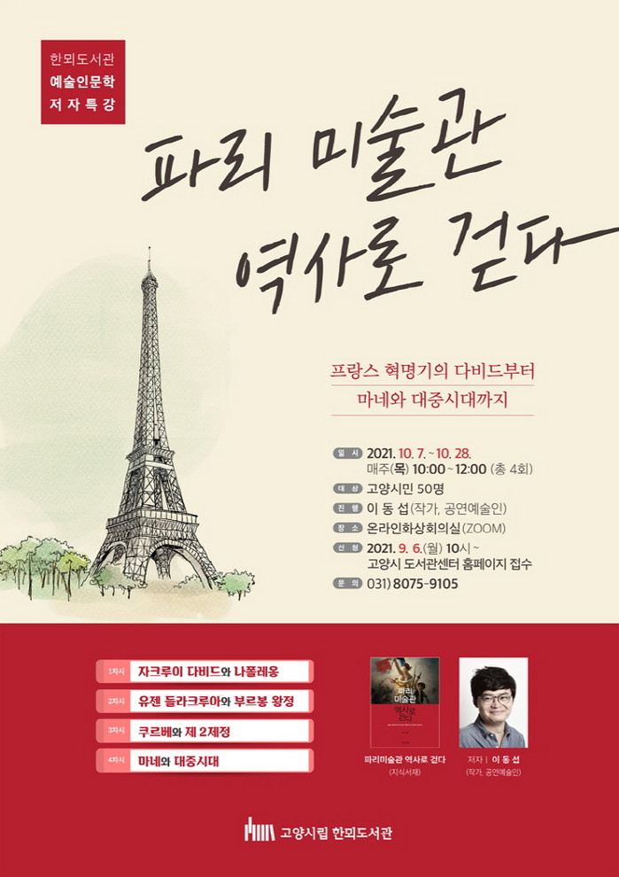 [부자동네타임즈 김인수기자] 고양시 한뫼도서관은 코로나 19로 대면활동이 제한된 시민들의 문화공백을 채우기 위해 ‘파리 미술관, 역사로 걷다’를 온라인으로 운영한다.