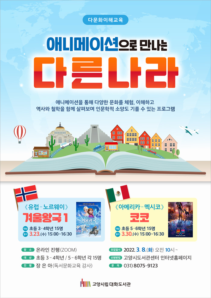 [부자동네타임즈 김인수기자] 고양시 대화도서관은 어린이들을 위한 다문화 이해 프로그램 「애니메이션으로 만나는 다른 나라」을 온라인 운영한다.