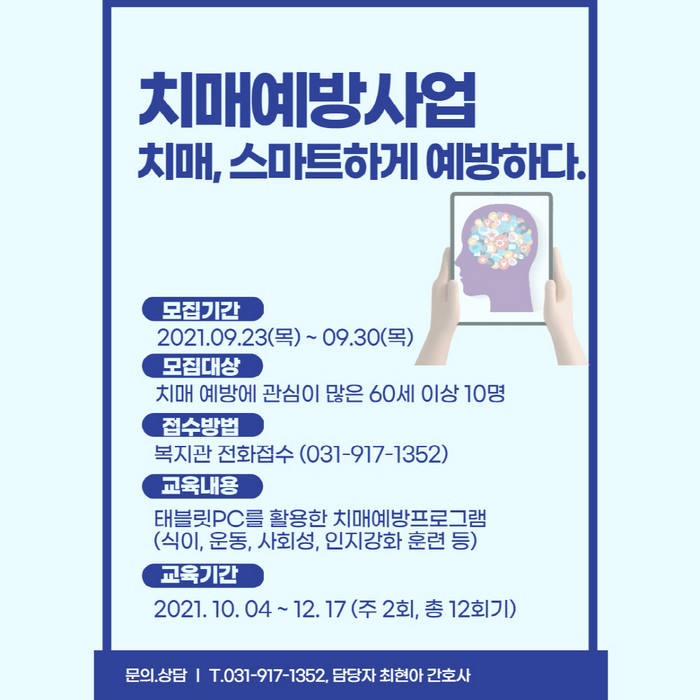 [부자동네타임즈 김인수기자] 고양시대화노인종합복지관(관장 최윤정)에서는 9월 23일(목)부터 9월 30일(목)까지‘치매, 스마트하게 예방하다’참여자를 모집한다.