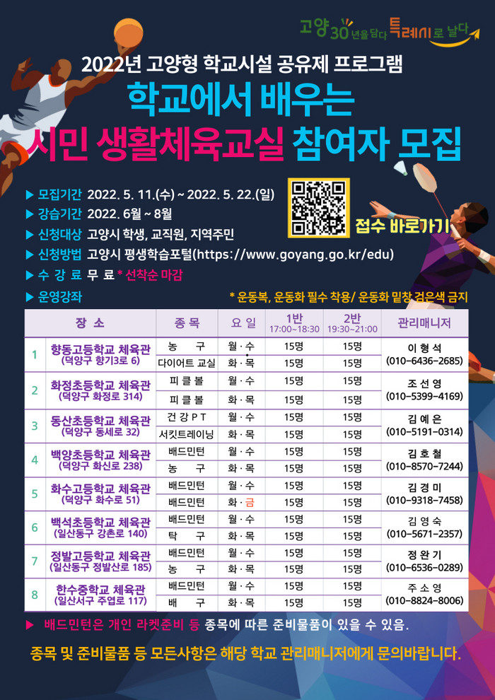 올해 처음 운영되는 고양형 학교시설 공유제는 향후 참여학교를 늘려 지역주민이 언제든 쉽게 생활체육을 접할 수 있도록 확대 추진할 계획이다.