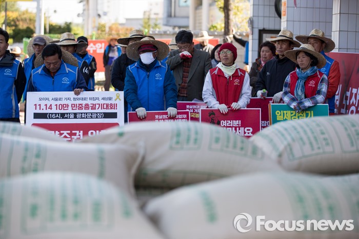(청주=포커스뉴스) 30일 오후 청주 새누리당 충청북도당 앞에서 충북농민대회 참가자들이 쌀값폭락 대책마련 촉구 새누리당 규탄 대회를 열고 있다.