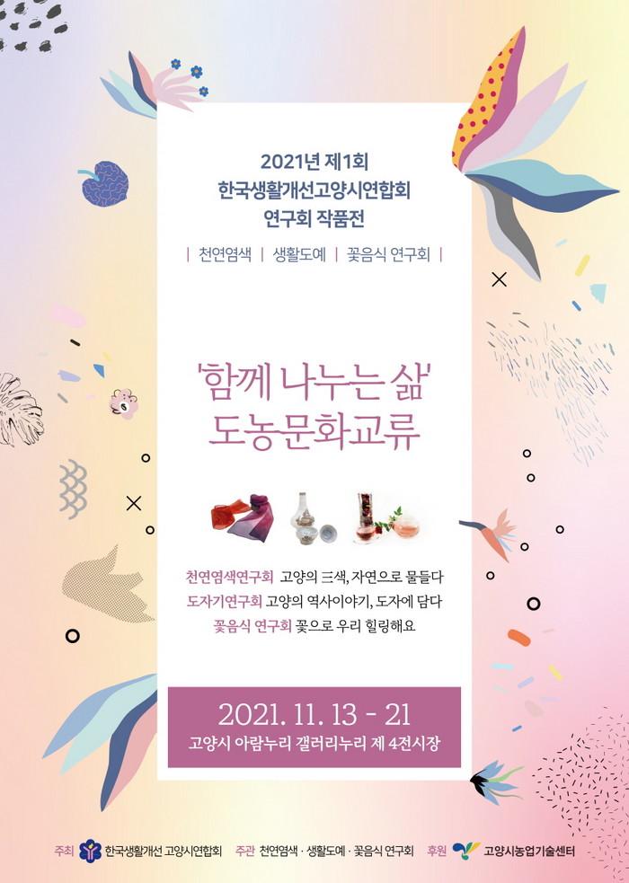 ‘함께 나누는 삶’ 작품전에서는 고양의 색을 자연식물로 표현한 천연염색과 고양의 역사이야기를 도자기에 담아낸 도자작품, 식용꽃을 활용한 힐링 꽃음식 등 100여 점이 전시될 예정이다.