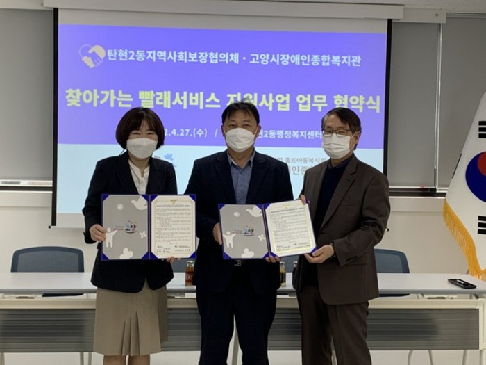 [부자동네타임즈 김인수기자] 고양시 일산서구 탄현2동지역사회보장협의체(공동위원장 이종신, 박병일)는 지난 27일 ‘찾아가는 빨래서비스’운영을 위해 고양시장애인종합복지관과 업무협약을 체결했다.