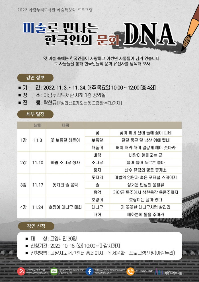 [부자동네타임즈 김인수기자] 고양특례시(시장 이동환) 아람누리도서관이 오는 11월 3일부터 24일까지 매주 목요일 오전 10시부터 4회에 걸쳐 예술특화프로그램 ‘미술로 만나는 한국인의 문화 DNA’강좌를 운영한다.