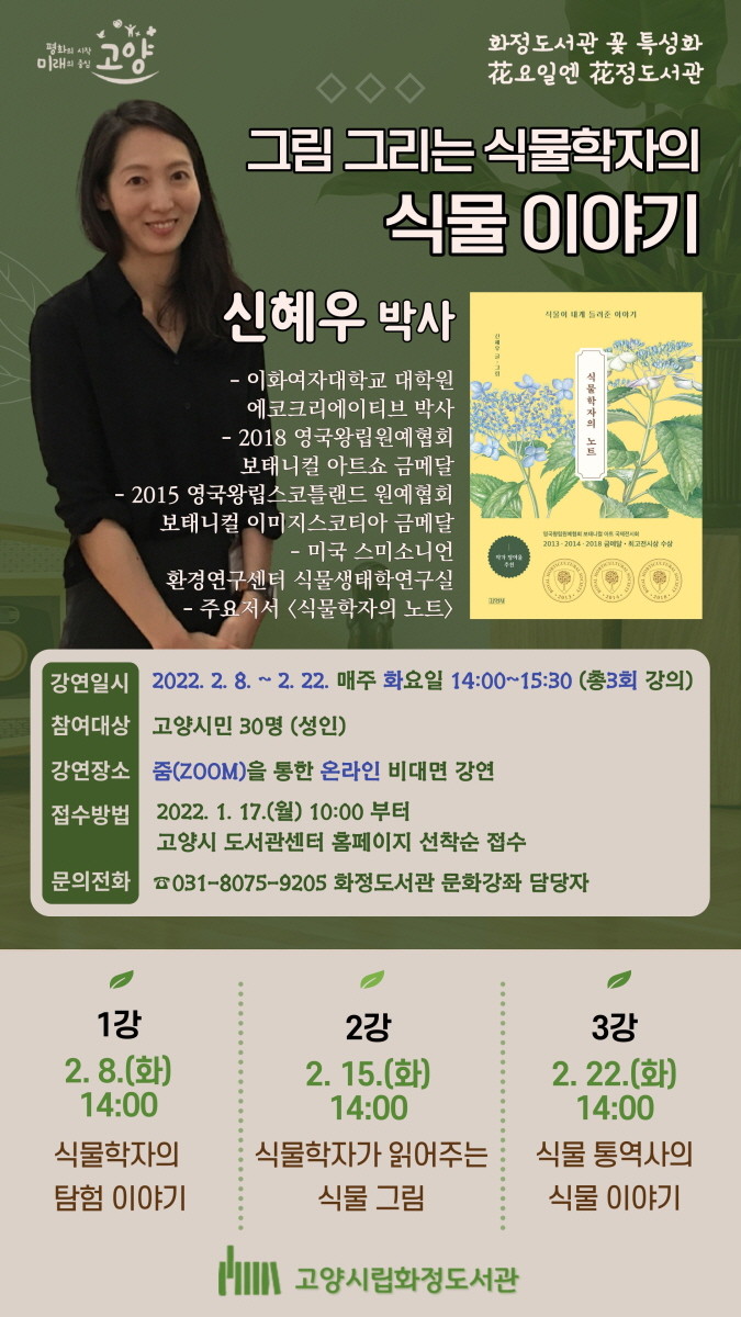 ‘그림 그리는 식물학자의 식물이야기’는 꽃 특성화 도서관인 화정도서관이 ‘花요일엔 花정도서관’이란 테마로 연중 진행하는 꽃 특성화 강좌의 2022년 첫 강연이다.