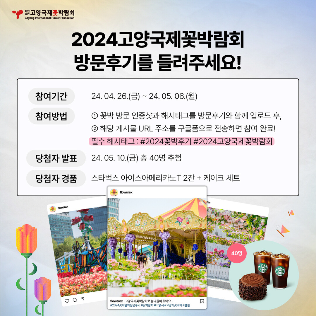 2024고양국제꽃박람회 활성화를 위해 진행하고 있는 이번 이벤트는 재단법인 고양국제꽃박람회 인스타그램, 페이스북, 네이버 공식 블로그 등 소셜네트워크서비스(SNS)를 통하여 참여할 수 있다. 참여자 중 40명을 추첨해 커피 모바일 상품권을 제공한다.