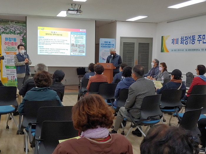 이번 주민총회에는 당일 현장투표(31명)와 사전투표(301명)로 지역주민 총 332명이 참여했다. 2022년 주민자치사업의제로 1위는 찾아가는 행복나눔사업(146명), 2위는 미르샘 마을정원 재정비사업(107명), 3위는 문화가 숨쉬는 희망화정사업(79명)이 선정됐다.