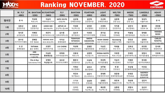 [부자동네타임즈 김인수기자] 한국 최대 입식격투기 단체 MAX FC가 18일 2020년 11월 체급별 랭킹을 발표했다. 총 11개 체급의 9명의 챔피언과 더불어 체급별 10위까지 랭킹을 발표했다.