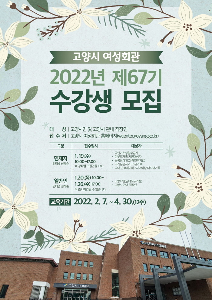 [부자동네타임즈 김인수기자] 고양시 여성회관이 2월 7일부터 67기 정규강좌를 개강함에 따라 오는 1월 19일부터 수강생을 모집한다.